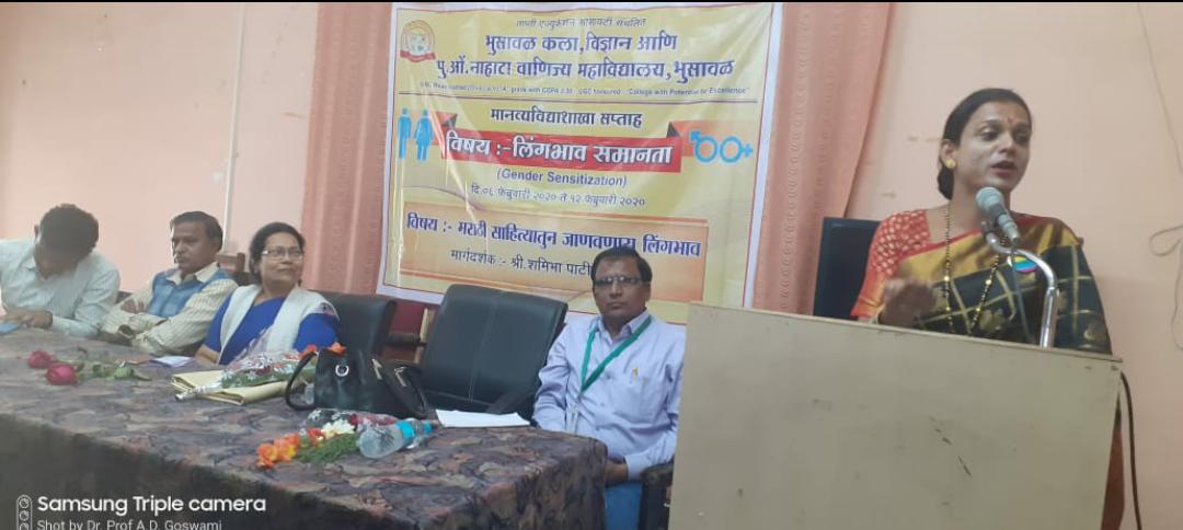 येथील भुसावळ कला,विज्ञान व पु.ओं.नाहाटा वाणिज्य महाविद्यालय भुसावळ मधील मानव्यविद्या शाखा अंतर्गत लिंगभाव समानता याविषयावर आधारित व्याख्यानमालेच आयोजन करण्यात आलेले आहे.त्यातील पाहिले व्याख्यान तृतीयपंथी चळवळीतील समाजसेवक श्री.शमीभा पाटील यांचे व्याख्यान आयोजित करण्यात आले.त्यांच्या व्याख्यानाचा विषय’मराठी साहित्यातील लिंगभाव समानता’हा होता.कार्यक्रमाची सुरुवात वृक्षपूजन करून करण्यात आली.व्यासपीठावर कार्यक्रमाचे अध्यक्ष उपप्राचार्य डॉ.ए. डी. गोस्वामी,श्री शमीभा पाटील,सी.डी. सी.चे सदस्य डॉ.जे.एफ.पाटील,डॉ.रेखा गाजरे, डॉ.प्रफुल्ल इंगोले इ मान्यवर उपस्थित होते. कार्यक्रमाच्या सुरुवातीला प्रस्ताविकेत प्रा.प्रफुल्ल इंगोले यांनी मानव्यविद्या शाखेअंतर्गत घेण्यात येणाऱ्या लिंगभाव समानता सप्ताहाची रुपरेषा मांडली. प्रमुख वक्ते शमीभा पाटील म्हणाल्या की,साहित्य हे जिवंत माणसाला अनुभवातून भावना व्यक्त करण्यासाठी प्रेरित करीत असते.एकसमान मूल्य असणारी समाजव्यवस्था निर्माण करायची गरज आहे.त्यासाठी वास्तवदर्शी साहित्य लिहिले गेले पाहिजे.सध्या आपण क्रांतीच्या मध्यभागी जन्माला आलेले अभागी आहोत.लिंग विषमतेची पाळेमुळे नष्ट केल्याशिवाय सुजाण नागरिक घडू शकणार नाही.सातवाहन काळातील गाथासप्तशती या ग्रंथात लिंगभाव समानता दिसून येते.१९७२नंतरच्या मराठी साहित्यात लिंगभाव मोठ्या प्रमाणात जाणवू लागला.सिमोन बोव्हा यांच्या सेकंड सेक्स नावाच्या ग्रंथामूळे लिंगभाव विचार जगात मोठया प्रमाणात रुजू झाला.मराठी साहित्यात महानुभाव साहित्यिक महादसा यांच्या धवळ्यातून लिंग समानता दिसून आली.आजच्या काळातील रंगनाथ पठारे यांची सातपाटील कुलवृत्तांत या कादंबरीत लिंगभाव दिसून येतो. अध्यक्षीय भाषणात उपप्राचार्य डॉ.गोस्वामी म्हणाले की, मानव्यविद्या शाखेअंतर्गत विविध कार्यक्रमाचे आयोजन केले जाते.विद्यार्थ्यांच्या सर्वांगीण विकासासाठी महाविद्यालय सर्वोतोपरी प्रयत्न केले जातात. अशाच प्रयत्नातून या सप्ताहाचे आयोजन करण्यात आलेले आहे.आजच्या व्याखानातुन लिंगभाव समानता ही विद्यार्थ्यांनी अंगिकरावी.कार्यक्रमाचे सूत्रसंचालन प्रा.पुरुषोत्तम महाजन यांनी तर आभार प्रा.उज्ज्वला महाजन यांनी केले. कार्यक्रमाला जेष्ठ नागरिक संघातील सदस्य उपस्थित होते.कार्यक्रमाच्या यशस्वीतेसाठी डॉ.पी.ए. अहिरे,प्रा.आशिष नवघरे,प्रा.प्रशांत पाटील,प्रा.दीपक शिरसाट,डॉ.सचिन राजपूत,प्रा.दिनानाथ पाठक,प्रा.निखिल तायडे,डॉ.रुपाली चौधरी,प्रा.भारती सोनवणे,डॉ.स्वाती महाजन इ प्राध्यापकांनी परिश्रम घेतले.कार्यक्रमाला मोठ्या संख्येने विद्यार्थी उपस्थित होते.