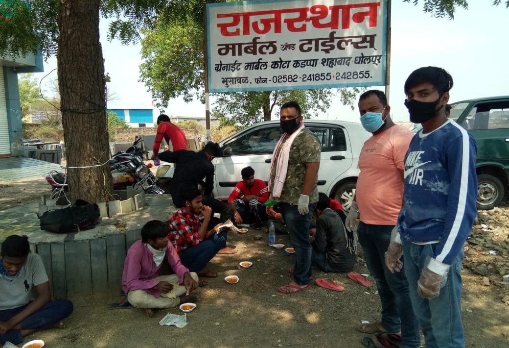 या भुकेल्यांना नाष्टा व जेवण देवून मदतीचा हात देण्याकरीता येथील आर्य निवास लॉजिंग बोर्डिंग , प्रेम निवास लॉज, श्री वॉटर प्लांट, यांच्या सहकार्याने राष्ट्रीय महामार्गावर दररोज सुमारे १५० ते २०० लोकांना सकाळी नाष्टा बिस्किट्स व भाजी, चपाती जेवण , पिण्याचे पाणी , देण्यात येत आहे .याकरीता हर्षल योगेश जोशी, शिवधर रमाशंकर दुबे, दर्शन रमेश परदेशी, अंकीता सिंग, मणी भूषण पांडे, कृष्णा उदयसिंग काके , परिश्रम घेत आहे .