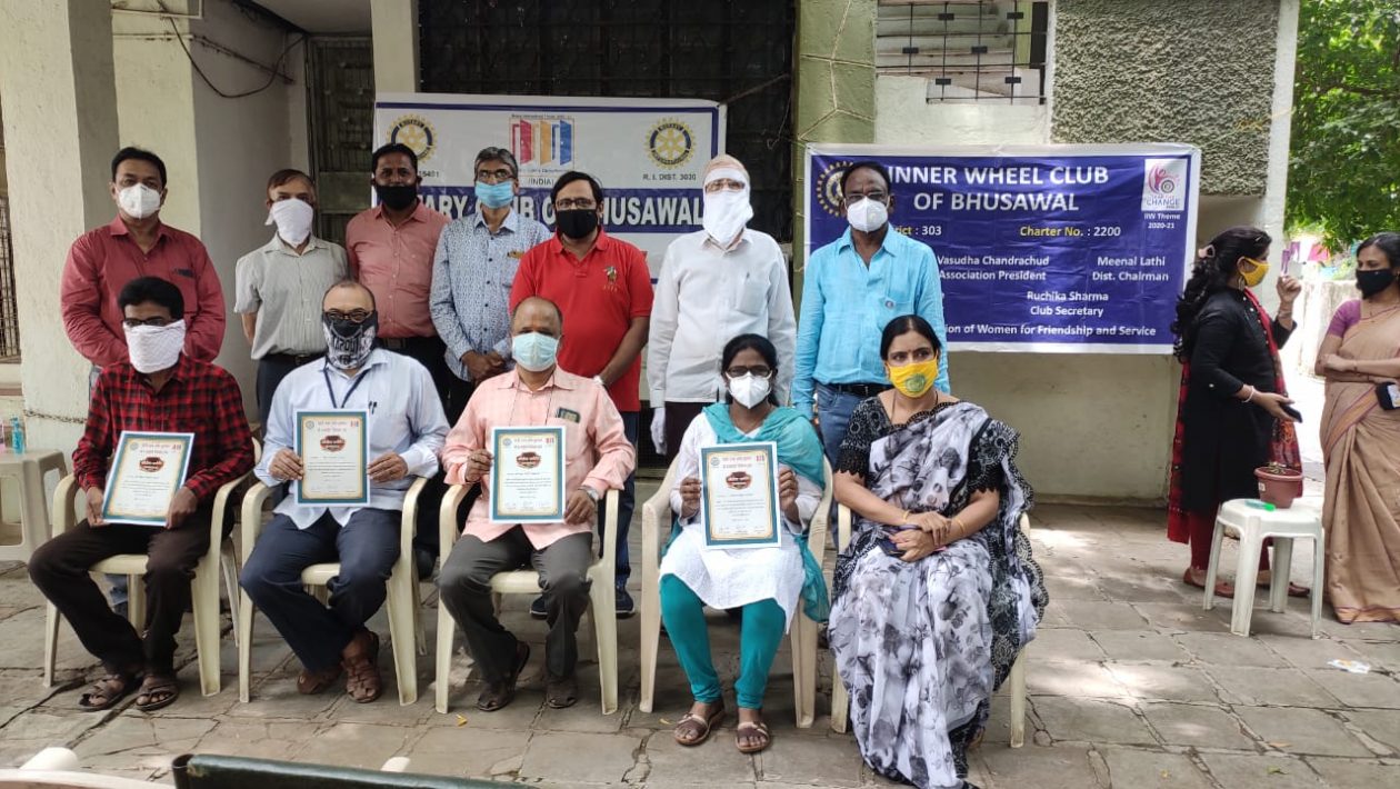 २७ जुलै सोमवार रोजी रोटरी क्लब आॅफ भुसावळ व बी.ए.लाहोटी चॅरिटेबल ट्रस्टच्या संयुक्त विद्यमाने रोटरी भवनात आयोजित पत्रकार सन्मान कार्यक्रमात बोलत होते. या कार्यक्रमात संजयसिंग चव्हाण, शेख सत्तार,आशिष पाटील, श्रीकांत जोशी, उज्ज्वला बागुल, उदय जोशी, निरज वाघमारे (मोना ) , प्रेम परदेशी,अभिजीत आढाव, निलेश फिरके, संजय काशीव,शाम गोविंदा,हबीब चव्हाण, कमलेश चौधरी,सुनिल सूर्यवंशी,संतोष शेलोडे,कालू शाह,शकील पटेल,संजय ठाकूर,कलीम पायलट आदी पत्रकार व छायाचित्रकारांना सोलापूर चादर,सॅनीटायझर,मास्क व कोरोना योध्दा सन्मानपत्र देऊन सन्मानित करण्यात आले. यावेळी जी.आर.ठाकूर पुढे म्हणाले कि,प्रत्येकाच्या सु:खदुखा:त पत्रकार नेहमी धावून येत मदत करतात मात्र याच पत्रकारांनाच समाज विसरतो. सर्वसामान्य जनतेला मदत करणा-या पत्रकारानंतर पुढील टप्प्यात पोलीस,महसूल,नगरपरिषद अधिकारी,कर्मचारी व सफाई कामगारांचा लवकरच कोव्हीड १९ योध्दांना सन्मानित करण्यात येणार असल्याचे ठाकूर म्हणाले.अध्यक्षीय मार्गदर्शन करतांना अरूण मांडाळकर सर यांनी सांगितले कि,सर्वच संघटनांना नेहमी पत्रकाराची कुठल्याही मदतीची अपेक्षा न ठेवता मदत मिळते.त्यामुळे असे लाॅकडाऊन मुळे छोटेखानी का नसो पत्रकारांसाठी हे कार्यक्रम व्हायला पाहिजे असे स्पष्ट केले. रोटरी क्लबचे अध्यक्ष जी.आर.ठाकूर,माजी अध्यक्ष राजेश अग्रवाल,अरूण मांडळकर,महेश भराडे,सतिश अग्रवाल,राजेश जोशी,गोपाल तिवारी,खुशाल जोशी,मदन बोरकर,सारंग चौधरी या मान्यवरांच्या हस्ते पत्रकार व छायाचित्रकारांना सन्मानित करण्यात आले.कार्यक्रमासाठी राधेश्याम लाहोटी,आरती चौधरी यांचेही सहकार्य लाभले.आभार प्रदर्शन राजेश अग्रवाल यांनी केले.यशस्वीतेसाठी मनोज गुलईकर यांनी परिश्रम घेतले