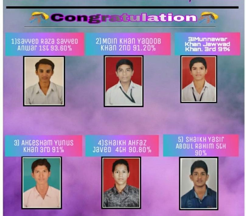 येथील खडका रोड भागातील उर्दु एज्युकेशन सोसायटी संचलित बी.झेड.उर्दु हायस्कूलचा इयत्ता दहावीचा निकाल ९१ टक्के लागला आहे. यात ९३.६० टक्के गुण मिळवून सैय्यद रजा सैय्यद अन्वर प्रथम,९१.२० मोईन खान याकुब खान व्दितीय,मुनव्वर खान जव्वाद खान आणि अहेतेशाम खान युनूस खान हे दोघंही ९१ टक्के गुण मिळवून शाळेत तृतीय ठरले.शेख अहफाज जावेद ९०.८० व शेख यासीर अब्दुल रहीम या विद्यार्थ्याला ९० टक्के गुण मिळाले.यशस्वी विद्यार्थ्यांचे अध्यक्ष हाजी आशिक खान,प्राचार्य तबस्सुम निगार यांच्यासह पदाधिकारी व शिक्षकांनी अभिनंदन केले आहे.
