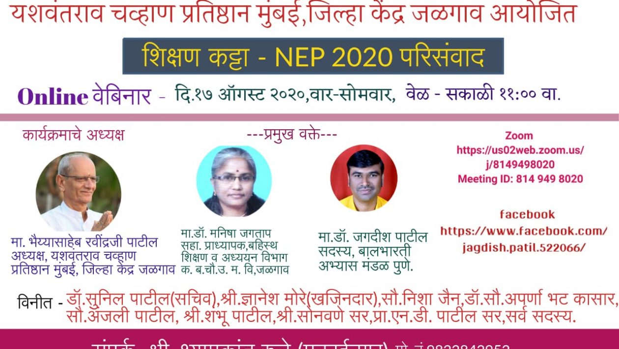 यशवंतराव चव्हाण प्रतिष्ठान मुंबई जिल्हा केंद्र जळगाव यांच्यातर्फे शिक्षण कट्टा कार्यक्रमांतर्गत नवीन शैक्षणिक धोरण धोरणावर आधारित वेबिनार परिसंवाद सोमवार, दि. 17 ऑगस्ट 2020 रोजी सकाळी 11 वाजता आयोजित करण्यात आला आहे.