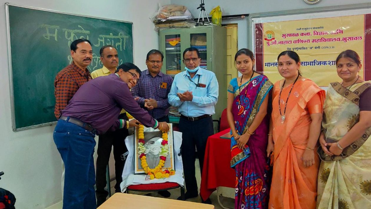 भुसावळ – मानस नीती व सामाजिक शास्त्र मंडळांतर्गत आणि मराठी विभाग यांच्या संयुक्त विद्यमाने महात्मा फुले जयंती साजरी करण्यात आली . यावेळी अध्यक्षस्थानी म्हणुन महाविद्यालयाचे उपप्राचार्य डॉ.ए.डी. गोस्वामी होते. तर प्रमुख वक्ते म्हणून प्रा. डॉ. के के अहिरे होते.कार्यक्रमाच्या सुरुवातीला मानस नीती व सामाजिक शास्त्र मंडळाचे चेअरमन प्रा . साहेबराव राठोड यांनी प्रास्ताविक करताना मंडळाची भूमिका विशद करताना महापुरूष, महानायक, महा मानव, यांच्या जयंत्या पुण्यतिथी आयोजन करून त्यांच्या विचारांना वैचारिक रीत्या उजाळा दिला जात असतो. त्यातून विद्यार्थ्यांची वैचारिक जडणघडण होत असते अशी भूमिका मांडली .