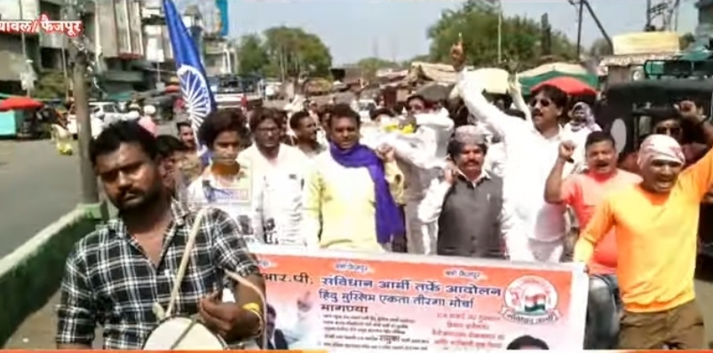 मनसेचे अध्यक्ष राज ठाकरे यांनी मुस्लिमांच्या मज्जित वरील भोंगे काढण्याचा विषय लावून धरला आहे, त्यामुळे हिंदू मुस्लिम समाजामध्ये तेढ निर्माण होऊन जातीय दंगली घडविण्याचा प्रकार चालविला आहे ,त्या निमित्ताने संविधान आर्मी संघटनेचे राष्ट्रीय अध्यक्ष जगन सोनवणे आणि विविध दहा संघटनेचे पदाधिकारी यांच्यावतीने सोमवार रोजी फैजपूर येथील सुभाष चौक येथून प्रांताधिकारी कार्यालयात पर्यंत राज ठाकरे यांच्या प्रतिकात्मक पुतळ्याचे प्रेतयात्रा काढण्यात आली ,व प्रांताधिकारी कार्यालयासमोर राज ठाकरे यांच्या प्रतिकात्मक पुतळ्याचे दहन करण्यात आले राज ठाकरे यांना (रासुका) राष्ट्रीय सुरक्षा कायद्या अंतर्गत अटक करण्याची मागणी निवेदनात करण्यात आली,