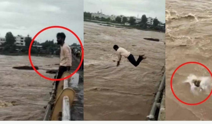 मालेगावमधून वाहणाऱ्या गिरणा नदीवर केटीवेअर बंधारा बांधण्यात आला असून पुरामुळे त्यावरुन पाणी वाहत आहे. याच पुराच्या पाण्यात गिरणा नदीच्या पुलावरुन एका तरुणाने उडी मारल्याचा व्हिडीओ समोर आला आहे.