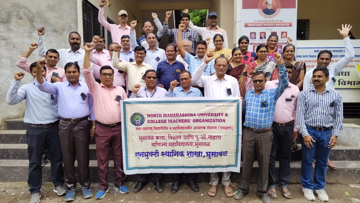 भुसावळ – येथील भुसावळ कला, विज्ञान आणि पू. ओं. नाहाटा वाणिज्य महाविद्यालयातील प्राध्यापकांनी आज महाराष्ट्र शासनाच्या अन्याय जनक वर्तणुकीमुळे काळ्या फित लावून काम केले .71 दिवसाच्या परीक्षांच्या बहिष्कार कालावधीतील अर्धवट वेतनाची वाटणी 18 जुलै 2018 यूजीसी रेगुलेशन ची अर्धवट अंमलबजावणी प्राध्यापकांचे प्रमोशनचे प्रश्न पेन्शनचे प्रश्न यासारख्या मागण्यांच्या संदर्भात शासनाचे लक्ष वेधण्यासाठी आंदोलनाचे विविध टप्पे महाराष्ट्र प्राध्यापक महासंघ, एन .मुक्टो .केंद्रीय कार्यकारिणी तसेच जिल्हा कार्यकारणी च्या आदेशानुसार संघटनेच्या स्थानिक शाखेतर्फे राबविण्यात येत असून याचाच आजचा सहाव्या टप्प्यात काळ्या फित लावून काम केले .यावेळी संघटनेचे सर्व पदाधिकारी प्रा. डॉ. ए. डी .गोस्वामी, प्रा. डॉ.पी. ए .अहिरे, प्रा. डॉ. एस. पी .झनके ,प्रा. डॉ. जे. एफ .पाटिल डॉ. ममताबेन पाटील डॉ. किरण वारके प्रा डॉ. अनिल हिवाळे उपप्राचार्य डॉ. एस .व्ही. पाटील, डॉ. निळकंठ भंगाळे आदी मान्यवर तसेच सर्व सभासद बहुसंख्येने उपस्थित होते. यावेळी सर्व प्राध्यापकांनी शासनाच्या विरुद्ध घोषणाबाजी करून शासनाचा निषेध केला.