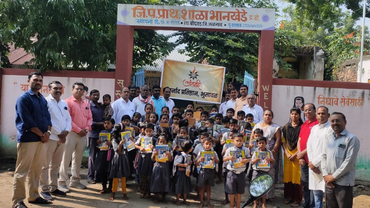 अंतर्नाद प्रतिष्ठानतर्फे गणेशाेत्सवात ‘एक दुर्वा समर्पणाची’ हा उपक्रम हाती घेण्यात आला आहे. त्यात बुधवारी बोदवड तालुक्यातील भानखेडा आणि विचवा येथील जिल्हा परिषद शाळे मधे शैक्षणिक साहित्य वाटप करण्यात आले. वाचन ही जीवन समृद्ध करणारी कला आहे. ती विद्यार्थी दशेत आत्मसात करणे सुलभ हाेते. अंतर्नादने गरज ओळखून जाे उपक्रम राबवला आहे, ताे पथदर्शी आहे, असे समन्वयक ज्ञानेश्वर घुले यांनी नमूद केले. प्रमुख पाहुणे म्हणून भानखेडा येथे सरपंच अनिल मोरे, शा.शि.स.अध्यक्ष अशोक निकम, उपाध्यक्ष उमा सुरवाडे , पो.पा.विठ्ठल निकम, ग्रा.प.स.मुकुंद निकम, मुख्याध्यापक सुभाष इंगळे, तर विचवा जि.प.शाळा येथे शा.व्य.स.अध्यक्ष प्रमोद तायडे, मुख्याध्यापक कविता पाटील यांची उपस्थिती होते.अंतर्नादचे संजय भटकर यांनी उपक्रमाचा उद्देश स्पष्ट केला. प्रकल्पप्रमुख समाधान जाधव यांनी प्रास्ताविक केले.आभार सह समन्वयक देव सरकटे यांनी मानले.