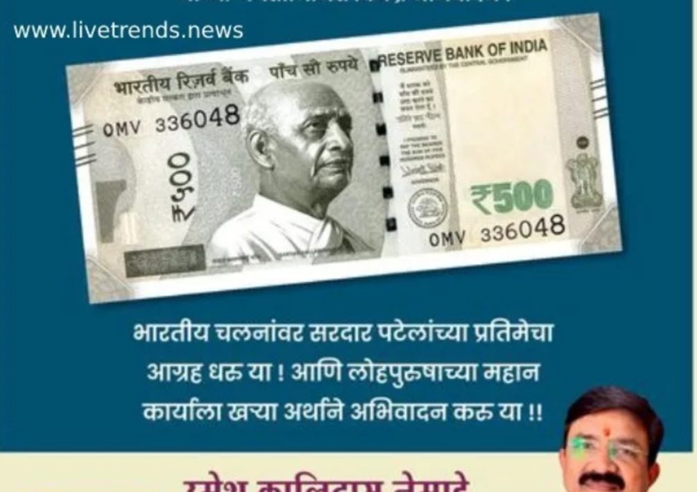 दरम्यान, भुसावळचे माजी नगराध्यक्ष तथा राष्ट्रवादीच्या ओबीसी सेलचे जिल्हाध्यक्ष उमेश नेमाडे यांनी चलनी नोटांवर अखंड भारताचे शिल्पकार असणारे सरदार वल्लभभाई पटेल यांची प्रतिमा नोटांवर हवी अशी मागणी केली आहे. उद्याच सरदार पटेल यांची जयंती असून याच्या पूर्वसंध्येला त्यांनी ही मागणी केली आहे.