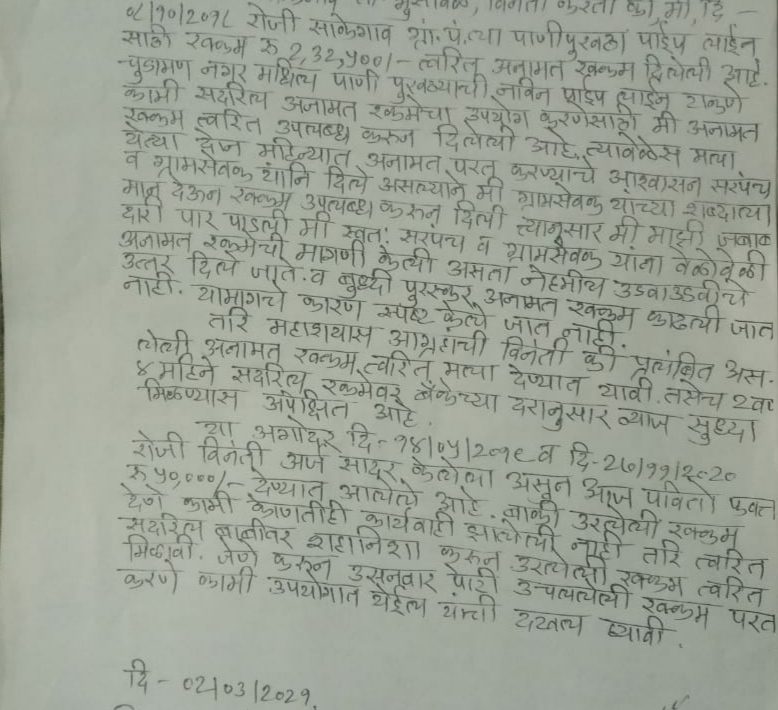 तालुक्यातील साकेगाव येथील ग्रामस्थांना कुपनलिकेतील क्षारयुक्त पाण्याचा पुरवठा केला जात होता . यामुळे नागरीकांना जलजन्य आजाराचा सामना करावा लागत असल्याने गावाला महाराष्ट्र औद्योगिक विकास महामंडळाच्या लगतच्या तापी नदी पात्रातुन जल वाहीनीद्वारे पाणी पुरवठा करण्याचा ग्रामपंचायतीमध्ये ठराव करण्यात आला . मात्र, यासाठी ग्रामपंचायतीकडे निधी उपलब्ध नसल्याने आर्थिक अडचण निर्माण झाली होती . यामुळे गावातीलच रहीवासी निवृत्ती रामा पवार यांनी पुढाकार घेऊन गावातील पाण्याची समस्या तातडीने मार्गी लावण्यासाठी ग्रामपंचायतीकडे ८ ऑक्टोंबर २०१८ रोजी २ लाख ३२ हजार ५०० रुपये अनामत रक्कम उधार म्हणून जमा केल्याने गावात तापी नदी पात्रातील पाण्याचा पुरवठा सुरु झाला आहे. याबाबत त्यांना ग्रामपंचायतीने अनामत रक्कमेची रितसर पावतीही दिली असून यानंतर त्यांनी ग्रामपंचायतीकडे आपल्या उधार दिलेल्या अनामत रक्कमेची वारंवार मागणी केली . मात्र, ग्रामपंचायती कडुन त्यांच्या या मागणीकडे चार वर्षापासुन दुर्लक्ष होत असल्याने त्यांनी भुसावळ पंचायत समितीचे गटविकास अधिकारी यांचेकडे अनामत रक्कम परत मिळावी यासाठी निवेदन दिले आहे . मात्र, पंचायत समिती विभागातुनही त्यांच्या निवेदनाची दखल घेतली जात नसल्याने ते आर्थिक अडचणीमुळे चांगलेच हतबल झाले आहेत . तर ग्रामपंचायतकडे सद्यस्थितीत निधी उपलब्ध नसल्याचे सरपंच यांनी सांगितले .