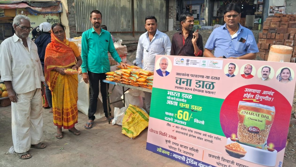 येथील छत्रपती शिवाजी महाराज चौकात वाढलेल्या महागाई थोपविण्यासाठी केंद्र शासनाने सर्वसामान्यांसाठी प्रति किलो ६० रू दराने हरभरा डाळ विक्रीस प्रारंभ करण्यात आला. दिनांक १९ रोजी सकाळी स्टॉल्स लावून गायत्री ट्रेडर्स तर्फे ही डाळ विक्री करण्यात आली. विक्रीचा स्टॉल्स सुरू झाल्यानंतर एक ते दीड तासाच्या आतच जवळपास ७० किलो डाळ विक्री करण्यात आली. भारत डाळ योजने अंतर्गत ही डाळ विक्री करण्यात आली.डाळ घेण्यास येणाऱ्यास आधार कार्ड वरील नंबर सांगणे आवश्यक असल्याने ज्या ग्राहकाला आधार कार्ड नंबर सांगता येईल त्यांनाच डाळ दिली जात आहे. अन्यथा आधार कार्ड सोबत घेवून जाणे आवश्यक आहे. गायत्री ट्रेडर्स मार्फत आणि कृषी उत्पन्न बाजार समिती तर्फे ही भारत चना डाळ याजने अंतर्गत विक्री सुरू आहे.चना डाळ विक्री स्टॉल्स वर लावण्यात आलेल्या फलकावर पंतप्रधान नरेंद्र मोदी यांचा आणि जिल्ह्यातील तीनही मंत्री गिरीश महाजन,गुलाबराव पाटील,अनिल पाटील आणि आमदार लताताई सोनवणे यांचे फोटो लावण्यात आले आहेत. या केंद्रावर सामाजिक कार्यकर्ते रवींद्र पाटील आणि त्यांचे सहकारी यांच्या मार्फत ही विक्री सुरू झाली आहे.यामुळे खुल्या बाजारात चना डाळ ७५ रू प्रति किलो दराने विक्री करण्यात येत आहे.मात्र या केंद्रावर महागाई स चाप बसवा म्हणून ६० रू प्रति किलो दराने विक्री करण्यात येत आहे.