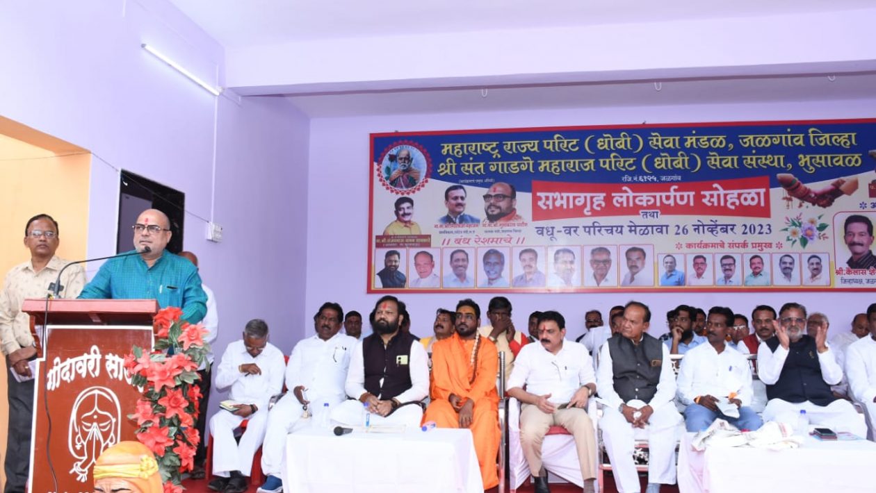 प्रारंभी मान्यवरांच्या हस्ते दीपप्रज्वलन करून संत गाडगे महाराज यांच्या पुतळ्याचे ना. गुलाबराव पाटील, आ. संजय सावकारे यांच्या हस्ते पूजन करण्यात आले. यावेळी समाजातील पदाधिकार्यांनी मान्यवरांचा सन्मान केला. तसेच समाजातील विविध क्षेत्रात कार्यरत असलेल्यांचा ना. पाटील व आ. सावकारे यांच्यासह मान्यवरांनी सन्मान केला. कार्यक्रमाचे अध्यक्षानी आ.संजय सावकारे होते. कार्यक्रमास उत्तर प्रदेश लखनऊ येथील पीठाधीश्वर प. पू. अशोक महाराज, पाणीपुरवठा व स्वच्छता तथा जिल्हा पालकमंत्री गुलाबराव पाटील, अ.भा. (धोबी) समाज राष्ट्रीय अध्यक्ष बालाजी शिंदे, व उपाध्यक्ष एकनाथ बोरसे, माजी नगराध्यक्ष युवराज लोणारी, महाराष्ट्र परिट (धोबी) सेवा मंडळ माजी प्रदेशाध्यक्ष विजयराव देसाई व प्रदेशाध्यक्ष राजेंद्र खैरनार, ज्येष्ठ मार्गदर्शक किसनराव जोर्वेकर, अ.भा. (धोबी) महासंघ राष्ट्रीय उपाध्यक्ष राजकुमार मालविय, पुणे येथील माजी उपमहापौर सुरेशराव नाशिककर, संत गाडगेबाबा स्मारक बांधकाम समिती प्रदेशाध्यक्ष दिलीपराव शिंदे, राष्ट्रीय ओबीसी युवा महासंघ प्रदेशाध्यक्ष चेतन शिंदे, मुंबई उच्च न्यायालय माजी न्यायमूर्ती किशोर सोनवणे आदी मान्यवर उपस्थित होते. याप्रसंगी महाराष्ट्र परिट (धोबी) सेवा मंडळ जिल्हाध्यक्ष वैâलास शेलोडे यांनी प्रास्ताविक केले. पुढे बोलतांना ना. गुलाबराव पाटील म्हणाले की, आज संविधानदिनी सुंदर कार्यक्रम होत आहे. समाजामध्ये स्वच्छता करण्याकरीता हा मेळावा आहे व राज्यामध्येही स्वच्छता व्हावी याकरीता मी मंत्री आहे. वधू-वर परिचय मेळावा काळाची गरज असून आता मुलींना हुंडा द्यावा लागत आहे. सध्या गडचिरोलीला जावे लागते लग्न जुळवायला. गडचिरोली, भंडारा, गोंदीया येथील मुली मुलावाल्यांना पसंत करतात. आता काळानुसार गोष्टी बदलत असतात. बीबीसीच्या बातम्या एकणारे आता मोबाईलवरच पिक्चर बघायला लागले, असेही ते म्हणाले. मुलींचे प्रमाण कमी असून राज्य जळगाव जिल्ह्याची स्थिती मी पाहिली असता १ हजार मुलांच्यामागे ८५९ मुली आहेत. १४१ मुले साधू होतील, अशी खंत त्यांनी व्यक्त केली. मुलीच्या आईचा आग्रह असतो की मुलगा नोकरीवालाच पाहिजे. मात्र धंदेवाला चार लोकांचे पोट भरतो त्यामुळे त्याच्या सोबत मुलीचे लग्न लावून दिले पाहिजे. परीट समाजामध्ये मुलीचे प्रमाण उत्तम आहे. वधू- वरांची उपस्थिती नसल्याची खंत आहे. ते पुढे म्हणाले की प्रत्येक समाजाने उठावे आणि आरक्षण मागावे. कदाचित आम्हालाही भिती वाटते की देशाच काय होणार आहे. पोटाला जात, धर्म नसते, पंथ माहित नसते. लोकप्रतिनिधी होत असतांना आम्हीसुद्धा छोट्या समाजामध्ये जन्माला आलो. काम करणार्याला समाज काही आडवा येत नसून निवडून येण्याकरीता इतर समाजाच