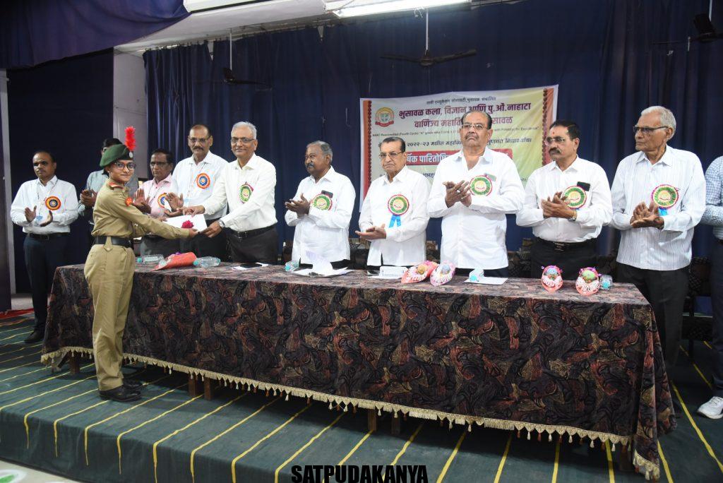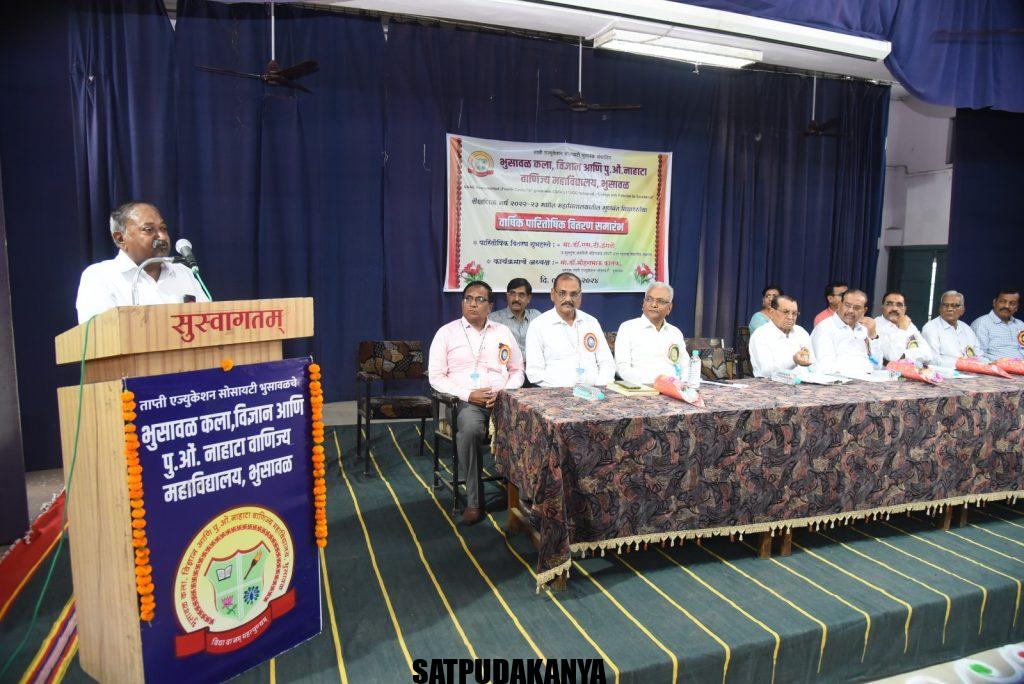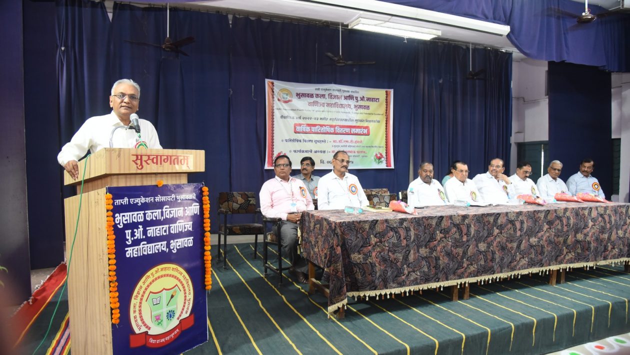 त्यांनी विद्यार्थ्यांच्या सर्वांगीण विकासासाठी पुस्तकी ज्ञानाबरोबरच महाविद्यालयात राबविल्या जाणाऱ्या एनएसएस, एनसीसी ,स्पोर्ट्स ,सांस्कृतिक कार्यक्रम इत्यादी महत्त्वाचे असतात अशी माहिती त्यांनी दिली तसेच विद्यापीठामार्फत राबवल्या जाणाऱ्या कमवा व शिका योजनेवर भाष्य करून विद्यापीठा मार्फत राबवल्या जाणाऱ्या योजनांवर प्रकाश टाकला याप्रसंगी कार्यक्रमाचे अध्यक्ष म्हणून ताप्ती एज्युकेशन सोसायटीचे अध्यक्ष डॉ. मोहन फालक अध्यक्षस्थानी उपस्थित होते त्यांच्या समवेत सचिव श्री विष्णू चौधरी कोषाध्यक्ष संजय नाहाटा ज्येष्ठ संचालक .प्रभाकर पाटील ,निळकंठ भारंबे महाविद्यालयाचे प्राचार्य डॉ. एस. व्ही .पाटील उपप्राचार्य डॉ. बी. एच. बऱ्हाटे डॉ. ए.डी. गोस्वामी समितीप्रमुख डॉ. एस.टी. धूम आधि सभा सदस्य प्रा. एकनाथ नेहेते कनिष्ठ महाविद्यालयाचे उपप्राचार्य प्रा. वाय .एम .पाटील पर्यवेक्षक प्रा. स्वाती पाटील व्यासपीठावर उपस्थित होते यावेळी कार्यक्रमाचे अध्यक्ष डॉ.मोहन फालक यांनी अध्यक्ष समारोप केला त्यात त्यांनी गुणवंत विद्यार्थ्यांच्या भावी जीवनाच्या शुभेच्छा देऊन कौतुक केले बक्षीसांपेक्षा कौतुकाची थाप महत्त्वाची असते असे मत व्यक्त केल त्यानंतर कला, वाणिज्य, विज्ञान विद्याशाखेतील तसेच एनएसएस एनसीसी क्रीडा कला सांस्कृतिक इत्यादी विभागांमध्ये विशेष पारितोषिके प्राप्त केली अशा एकूण 85 विद्यार्थ्यांना त्यांच्या पालकांसह मान्यवरांच्या हस्ते पारितोषिकेतून गौरविण्यात आले