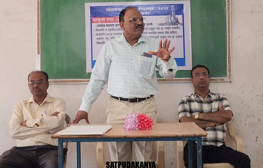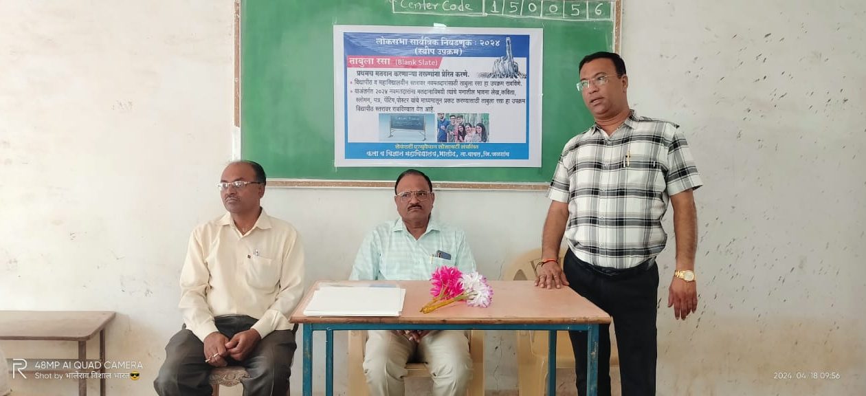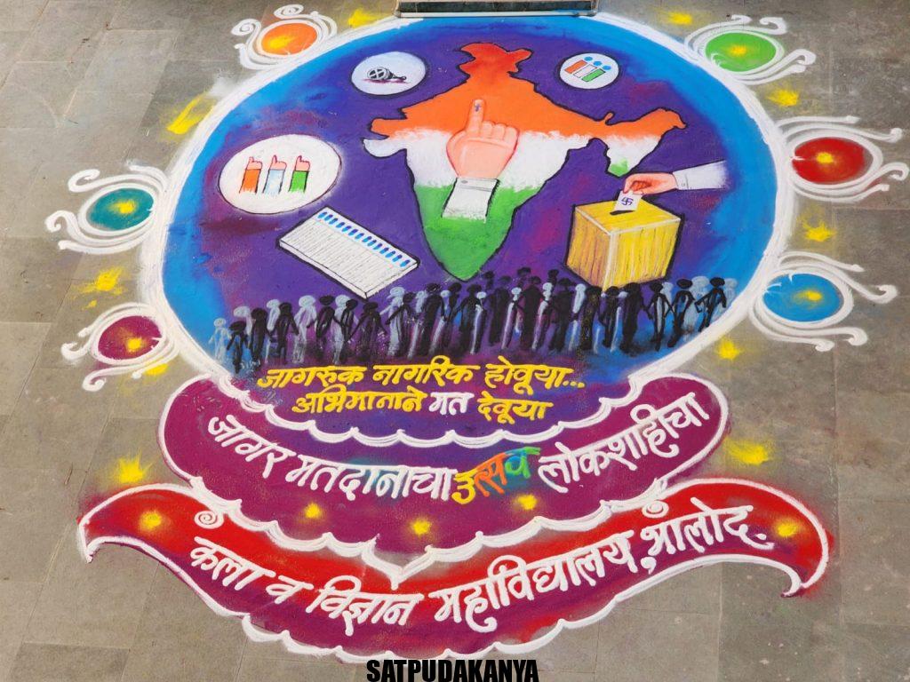 भुसावळ – सेकंडरी एज्युकेशन सोसायटी संचलित कला व विज्ञान महाविद्यालय भालोद येथे जागर मतदानाचा उस्तव लोकशाहीचा या अभिनव कार्यक्रमाचे आयोजन मतदार जागृतीच्या निमित्ताने करण्यात आले होते. भारत निवडणूक आयोग, महाराष्ट्र निवडणूक आयोग, जिल्हाधिकारी कार्यालय जळगाव ,कवयत्री बहिणाबाई चौधरी उत्तर महाराष्ट्र विद्यापीठ जळगाव, शिक्षण सहसंचालक कार्यालय जळगाव यांच्या सूचनेवरून मतदारांमध्ये मतदान करण्याची प्रवृत्ती अधिक वाढावी त्याकरिता ताबूला रसा या कार्यक्रमांतर्गत या विशेष एक दिवसीय लोकशाही उत्सवाचे आयोजन महाविद्यालयात करण्यात आले होते. महाविद्यालयाचे प्राचार्य डॉ किशोर कोल्हे यांच्या शुभहस्ते या कार्यक्रमाचे उद्घाटन करण्यात आले .मा जिल्हाधिकारी यांनी केलेल्या आवाहनानुसार शहरी उदासीनतेवर मात करण्यासाठी मी वोट केले ..सर्वांनी केले.., दिव्यांग व्यक्ती व ज्येष्ठ नागरिक यांना मतदानासाठी प्रेरित करण्यासाठी हम मे है दम, समाजातील वंचित घटकांना मतदानासाठी प्रेरित करण्यासाठी जागरूक नागरिक होऊया.. अभिमानाने मत देऊया …महिला मतदारांना प्रेरित करण्यासाठी जे हात मत देतात, ते जगावर राज्य करतात ..आणि महाविद्यालयीन विद्यार्थ्यांसाठी ताबूला रसा ब्लँक स्लेट या थीम वर आधारित विविध प्रकारचे कार्यक्रम महाविद्यालयात आयोजित करण्यात आले होते .विद्यापीठ आणि महाविद्यालयीन स्तरावर नव मतदारांसाठी ताबुला रसा हा कार्यक्रम आयोजित केला होता. या कार्यक्रमांतर्गत 2024 या वर्षी मतदान करणाऱ्या नव मतदारांना मतदानाविषयी त्यांच्या मनातील भावना, लेख, कविता, स्लोगन, पत्र, पेंटिंग ,पोस्टर ,यांच्या माध्यमातून प्रकट करण्यासाठी ताबूला रसा हा कार्यक्रम राबवण्यात आला. या कार्यक्रमांतर्गत एक सेल्फी पॉईंट मतदान जागृती साठी तयार करण्यात आला होता. देशाच्या सर्वांगीण विकासासाठी व सुरक्षिततेसाठी.. चला आपण मतदान करूया.., जागरूक नागरिक होऊया …अभिमानाने मत देऊया… अशा प्रकारच्या स्लोगन लिहिलेल्या सेल्फी पॉईंटवर विद्यार्थ्यांनी फोटो काढले व ते व्हाट्सअप ला स्टेटसला आणि डीपीला लावले. तसेच फेसबुक इंस्टाग्राम व्हाट्सअप या सोशल मीडियाच्या प्लॅटफॉर्मवर ते अपलोड केले. या निमित्ताने साखळी तालुका यावल येथील कलाकार चंद्रकांत पद्माकर नेवे यांनी मतदान जागृती च्या निमित्ताने एक सुंदर अशी मोठी रांगोळी रेखाटली होती. या रांगोळीने सर्वच आलेल्यांचे लक्ष वेधून घेतलेले होते .मतदार यादीमध्ये नाव शोधण्यासाठी एक बारकोड महाविद्यालयामध्ये दर्शनी भागात लावण्यात आला होता, या बारकोडला आपल्या मोबाईल मधून स्कॅन केल्यावर मतदार यादी चा भाग क्रमांक आणि अनुक्रमांक लगेचच शोधता येत होता .अनेक विद्यार्थ्या