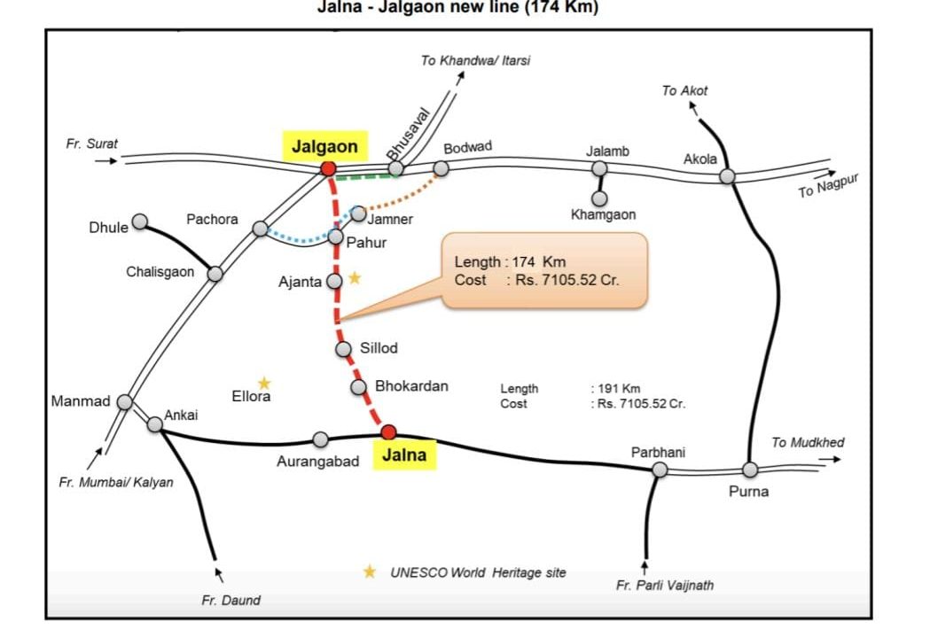 जालना ते जळगाव दरम्यान नवीन रेल्वे लाईन प्रकल्पाला मंत्रिमंडळाची मंजुरी मिळाली आहे. हा प्रकल्प 174 किलोमीटर लांबीचा आहे आणि युनेस्कोच्या जागतिक वारसा स्थळ अजिंठा लेण्यांशी जोडणीला चालना देईल. यामुळे मराठवाड्यापासून उत्तर महाराष्ट्रापर्यंत जलद मार्ग उपलब्ध होईल आणि सिल्लोड या भागात औद्योगिक वाढ होण्यास मदत होईल.