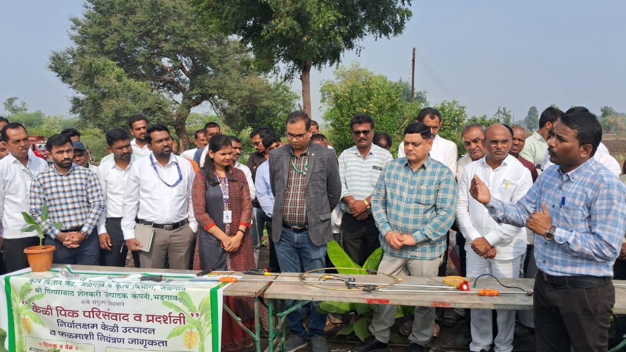 त्यानंतर पीक परीसंवादामध्ये डॉक्टर चंद्रशेखर गुप्ता यांनी अपडाच्या मार्गदर्शक सूचनेनुसार केळी निर्यात मधील अडसर ठरू शकणाऱ्या केळी फळमाशी ची ओळख प्रसार त्याचे योग्य व्यवस्थापन याविषयी सविस्तरपणे मार्गदर्शन केले त्यानंतर अपेडा मुंबई येथील बिझनेस डेव्हलपमेंट मॅनेजर श्रीमती प्रणिता चौरे यांनी केळी निर्यातीत लागणाऱ्या सुविधा परवाने व त्याची प्रक्रिया आणि यासाठी लागणारे अपेडा ची मदत या संदर्भात मनमोकळे प्रणाली मार्गदर्शन केले यामध्ये सोलापूर येथून आलेले विठ्ठल गंगा फार्मर्स प्रोड्युसर कंपनीचे संचालक श्री डोके व श्री शिंदे यांनी सोलापूर आणि जळगाव यांच्या केळी लागवडीतील फरक सोलापूरचा निर्यातीतील मोठा वाटा याची कारणमीमांसा सर्व शेतकऱ्यांसमोर मांडली व येथून होणाऱ्या निर्यादिशा चालण्यासाठी सदैव तत्पर असण्याचे आश्वासित केले तसेच विठ्ठल गंगा फार्मर्स प्रोड्युसर कंपनीच्या प्रक्षेत्रावरती आपण शेतकऱ्यांनी येऊन पाहुणचार करण्याची संधी आम्हाला द्यावी असेही आव्हान केले यानंतर नाबार्डचे जिल्हा विकास व्यवस्थापक श्री अमित तायडे यांनी ही सदर श्री गिरणा काठ एपीओ नाबार्डचे एक महत्त्वकांक्षी शेतकरी उत्पादन कंपनी असून यांना लागणाऱ्या सर्व सुविधा जसे की इंटिग्रेटेड पॅक हाऊस साठी नाबार्ड कडून मदत करण्याचे आश्वासित केले. यानंतर जिल्ह्याचे जिल्हाध्यक्ष कृषी अधिकारी श्री कुरबान तडवी यांनी केळी पिकातील निर्यातीसाठी भडगाव क्लस्टर मधील होत असलेल्या चळवळीचे कौतुक केले पण यासाठी बहुतेक सुविधा प्राप्त करून घेऊन प्रत्यक्षात जास्तीत जास्त केळी निर्यात कंटेनर या भागातून भरावेत यासाठी सर्व शेतकऱ्यांनी पुढाकार घेण्याचे आवाहन केले सदर कार्यक्रमांमध्ये केळी पिकाच्या पोषण मूल्याच्या महत्त्व प्रसारासाठी म्हणून मान्यवरांना केळी रोपटे कुंडी भेट म्हणून देण्यात आली तसेच मध्यंतरी सर्व उपस्थितांना उपहार म्हणून केळी फळ देण्यात आले. यानंतर कार्यक्रमाच्या शेवटी सर्वांनी सुरुची रानभोजनाचा आस्वाद घेतला सदर कार्यक्रम हा प्रत्यक्ष प्लॉट वरती तंत्रज्ञान मार्गदर्शन व प्रदर्शन अशा स्वरूपाचा उत्तम प्रतीचा आयोजकांनी आयोजित केला अशा प्रतिक्रिया प्रत्येक केळी बागायतदार यांनी दिल्या
