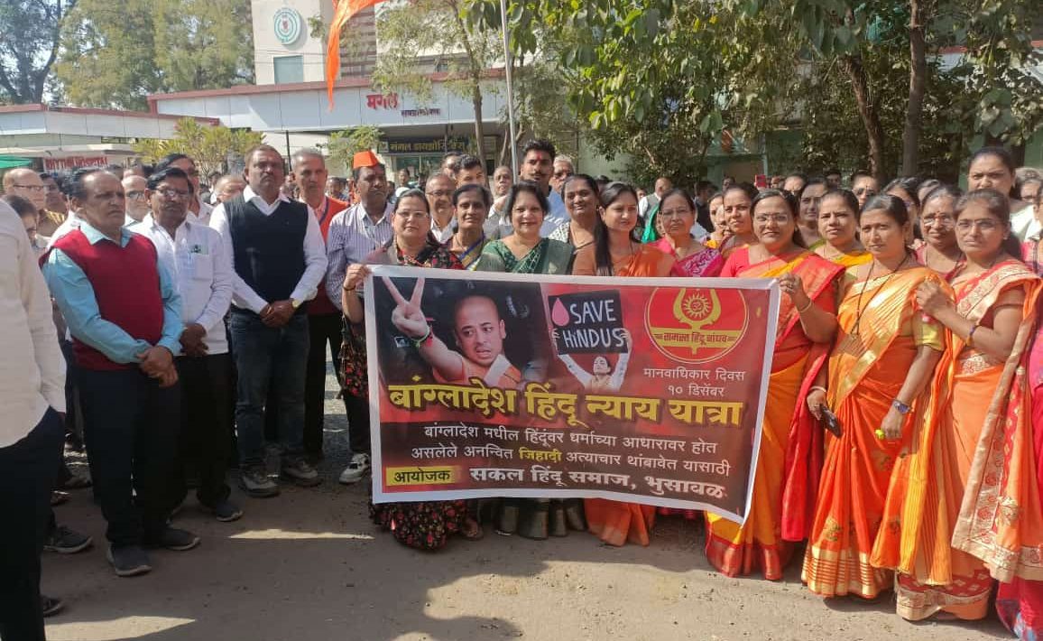 भुसावळ – बांगलादेशात हिंदूवर होत असलेल्या अत्याचाराच्या निषेधार्थ शहरातील सकल हिंदू समाजातर्फे मंगळवारी एक हजार नागरिकांसह महिलांच्या उपस्थितीत प्रांताधिकारी कार्यालयावर निषेध मोर्चा काढण्यात आला. शहरातील महाराणा प्रताप चौकात मंगळवारी सकाळी 10.30 वाजता सकल हिंदू समाजातील महिला, पुरूष जमा झाल्यानंतर त्यांनी हाती भगवा झेंडा घेत मोर्चाला सुरुवात झाली. महाराणा प्रताप चौकातून निघालेला हा मोर्चा गांधी पुतळा, तहसील कार्यालयावरून पंचमुखी हनुमान मंदिर, टेक्निकल हायस्कूलवरून प्रांताधिकारी कार्यालयावर नेण्यात आला. मोर्चात सकल हिंदू महिला, पुरूषांसोबतच संत, महंत सहभागी झाले.