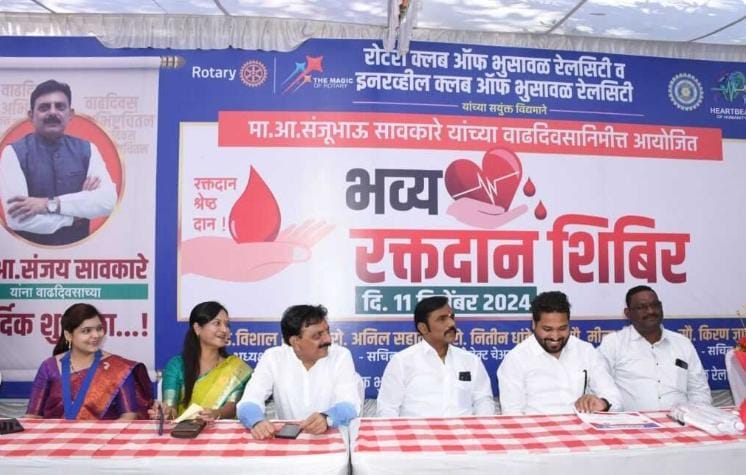 भुसावळ – भुसावळचे आमदार संजय सावकारे यांच्या वाढदिवसा निमित्त रक्तदान शिबिराचे आयोजन करण्यात आले होते. यावेळी रक्तदान हेच जीवनदान ह्या अनुषंगाने रोटरी क्लब चे सचिव अनील सहानी व सदस्य उमेश घुले, पुरुषोत्तम पटेल, सुधीर पाचपांडे, अनिकेत पाटिल,योगेश चौधरी यांच्या सह ३६ लोकानी रक्तदान करून समाजपयोगी उपक्रम राबवून आमदार संजयजी सावकारे यांचा वाढदिवस साजरा केला
