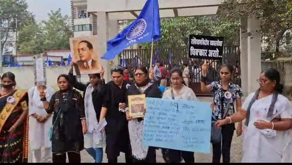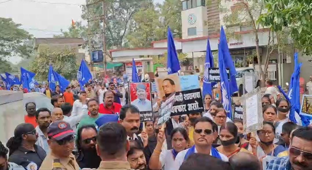 भुसावळ – परभणी येथील संविधान शिल्पकृती विटंबना प्रकरण तसेच पोलीस कस्टडीत आंदोलनकर्ते भीमसैनिक सोमनाथ सूर्यवंशी यांची हत्या झाल्याच्या निषेधार्थ येथील मोर्चा सकल बौद्ध समाज, संविधानप्रेमी,आंबेडकरवादी व तमाम भीमसैनिकांच्या (कृती समिती,)भुसावळ. तर्फे आज २३ डिसेंबर २०२४ रोजी सकाळी १० वाजता डॉ . बाबासाहेब आंबेडकर यांच्या पूर्णाकृती पुतळ्यापासून उपविभागीय अधिकारी (प्रांत ) कार्यालयावर मुकमोर्चा काढण्यात आला . यावेळी भीमसैनिक सोमनाथ सूर्यवंशीयांच्या मारेकऱ्यास त्वरित अटक करावी या प्रमुख मागणीसह मागण्या करण्यात आल्या यावेळी समाजसेविका निरंजना तायडे , राजश्री सोनवणे , वंदना सोनवणे , यांच्यासह महिलांच्या शिष्टमंडळाने तहसीलदार निता लबडे यांना निवेदन सादर केले .