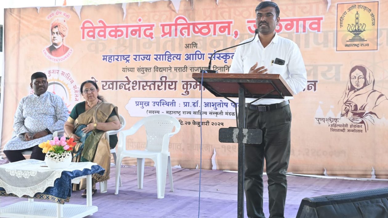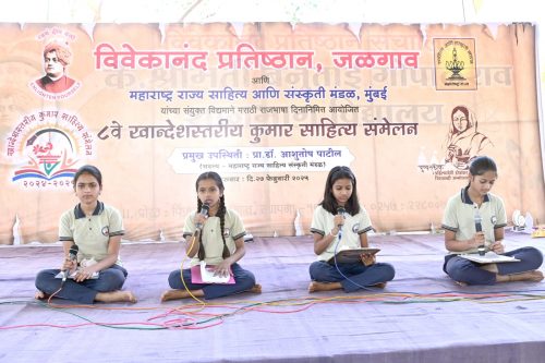 यावेळी व्यासपीठावर सांस्कृतिक विभाग प्रमुख किरण सोहळे व डॉ. अर्चना खानापूरकर उपस्थित होते. प्रवीण पाटील सर यांनी डॉ. जगदीश पाटील यांचा परिचय करून दिला. सूत्रसंचालन गौरवी सोनवणे व नंदिनी देसले यांनी केले. आठव्या खान्देशस्तरीय कुमार साहित्य संमेलनांतर्गत विविध शाळांचे संमेलन तालुकास्तरावर घेण्यात आले. त्यानंतर जिल्हास्तरावर निवड फेरी पार पडली. अहिल्यादेवी होळकर नगरी कै. श्रीमती ब. गो. शानबाग विद्यालयाच्या प्रांगणात विवेकानंद प्रतिष्ठानच्या विविध शाळांच्या निवडक सुमारे दीडशे विद्यार्थ्यांचे कुमार साहित्य संमेलन मराठी भाषा गौरवदिनी पार पडले.
