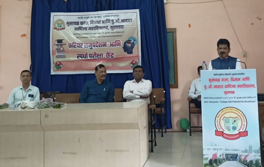 भुसावळ (प्रतिनिधी ) – भुसावळ कला, विज्ञान आणि पु.ओं. नाहाटा वाणिज्य महाविद्यालय भुसावळ येथे विविध स्पर्धा परीक्षेविषयी मार्गदर्शनपर व्याख्यान मोठ्या उत्साहात संपन्न झाले.या कार्यक्रमाला प्रमुख वक्ते म्हणून पी. एम. श्री जवाहर नवोदय विद्यालयाचे प्राचार्य डॉ. आर. आर. खंडारे उपस्थित होते.तसेच कार्यक्रमाच्या अध्यक्षस्थानी महाविद्यालयाचे प्राचार्य डॉ. बी. एच. बऱ्हाटे हे होते. प्रमुख पाहुणे म्हणून महाविद्यालयाचे उपप्राचार्य प्रा. डॉ. डी. एन. पाटील, उपप्रचार्य प्रा. डॉ. जी. आर. वाणी, करियर समुपदेशन व स्पर्धा परीक्षा मार्गदर्शन केंद्राचे प्रमुख प्रा.डॉ.चंद्रकांत सरोदे उपस्थित होते. कार्यक्रमाचे प्रमुख अतिथी आणि प्रमुख वक्ते प्राचार्य डॉ. आर. आर. खंडारे यांनी आपले मनोगत व्यक्त करताना सांगितले की, स्पर्धा परीक्षेची तयारी करताना सुरुवातीला विद्यार्थ्यांनी आपले ध्येय निश्चित करून नियोजनबद्ध अभ्यास करावा. स्वतःला कमजोर समजू नका. स्पर्धेच्या युगात आपले अस्तित्व काय याचा विचार करा. जीवनात अपयश, दुःख आले तर त्यावर मात करा. सर्वप्रथम मनाची तयारी करावी. वेळेचे नियोजन करावे तसेच परिस्थितीवर मात करावी. आपले आई वडील,गुरु यांची किंमत करणे. डॉ. बाबासाहेबांनी पहिले गुरु पुस्तकांना मानले. विद्यार्थ्यांनी स्पर्धा परीक्षेच्या अभ्यासक्रम लक्षात घेऊन त्यासाठी आवश्यक असणाऱ्या विविध मासिके, वर्तमानपत्राचे वाचन करावे. विद्यार्थ्यांनी स्पर्धा परीक्षेची आवड निर्माण करून त्याचे छंदात रूपांतर केले तर लवकर यशस्वी होता येते. अध्यक्षीय भाषणात महाविद्यालयाचे प्राचार्य डॉ. बी. एच. बऱ्हाटे म्हणाले की, कोणतेही शिक्षण कमी नाही. स्वप्न पूर्ण करता आली पाहिजे.विद्यार्थ्यांनी आपले ध्येय साधण्यासाठी स्पर्धा परीक्षेकडे लक्ष केंद्रित करावे व महाविद्यालयाच्या नाव लौकिकात भर टाकावी असे आवाहन केले.