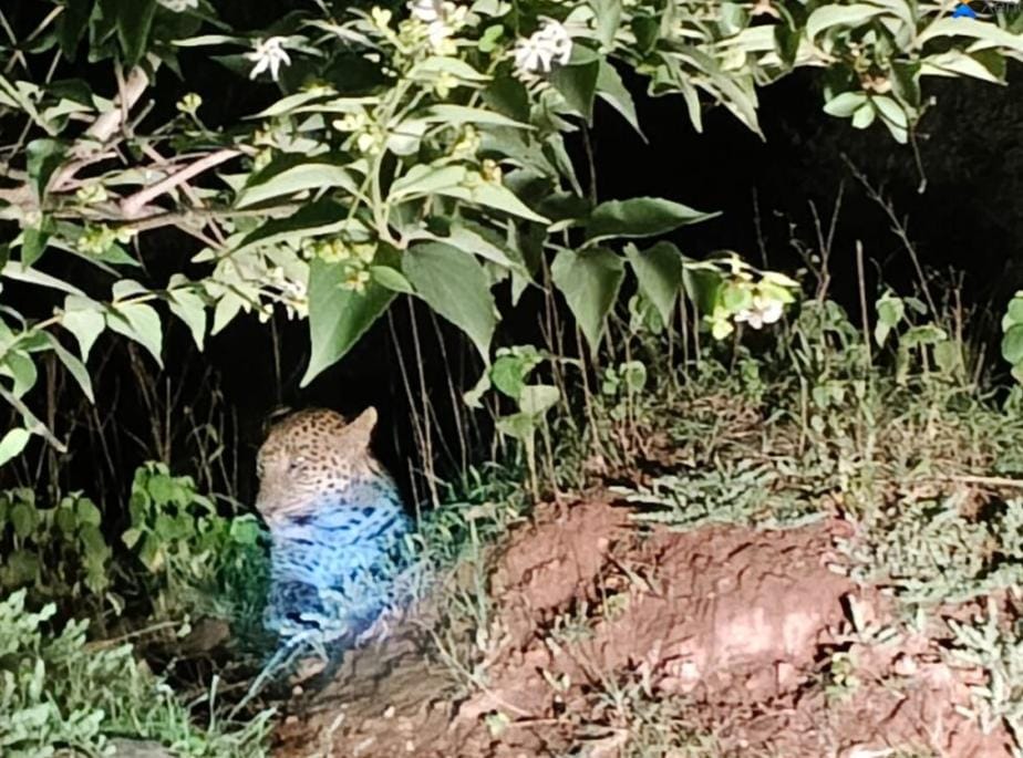 गाडीच्या हेडलाईटच्या तेजस्वी प्रकाशात बिबट्याचे चमचमणारे डोळे स्पष्ट दिसत होते. वाहनचालकाने तत्काळ गाडी थांबवली. सुमारे पाच मिनिटे बिबट्या रस्त्यावर इकडे-तिकडे फेरफटका मारत राहिला आणि मग निवांतपणे जंगलाच्या दिशेने गेला.
