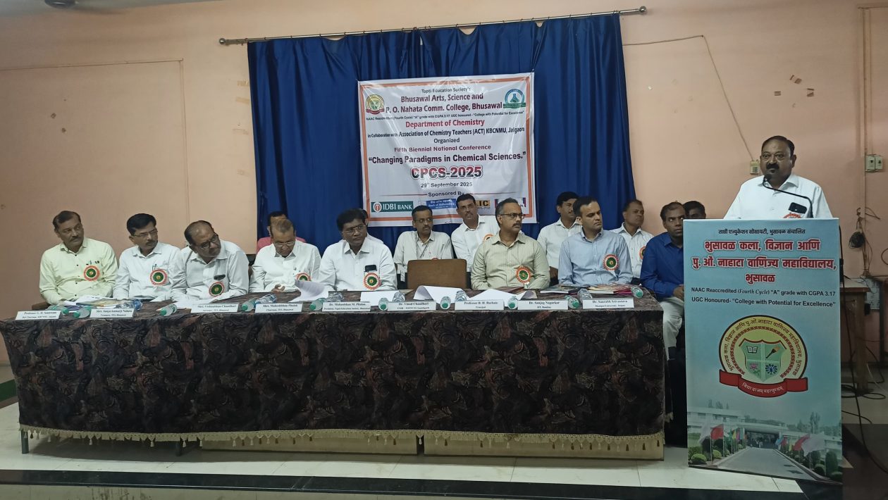 भुसावळ (प्रतिनिधी) – भुसावळ कला, विज्ञान आणि पु. ओं. नाहाटा वाणिज्य महाविद्यालयातील रसायनशास्त्र विभागातर्फे एक दिवसीय ‘रसायनशास्त्रातील बदलते परिमाणे’ (CPCS-2025) या विषयावर सलग पाचवी द्विवार्षिक राष्ट्रीय परिषद २९ सप्टेंबर २०२५ रोजी संपन्न झाली. या परिषदेसाठी अससोसिएशन ऑफ केमिस्ट्री टिचर्स सह आयोजक होते.