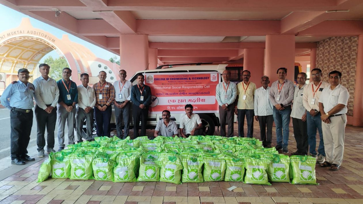 एकीकडे दिवाळी जवळ आली आहे तर अजूनही काही ठिकाणी महाराष्ट्रात अतिवृष्टीमुळे ओला दुष्काळाचे भीषण वास्तव आहे. याचे गांभीर्य ओळखून श्रम साधना ट्रस्ट संचलित अभियांत्रिकी महाविद्यालयाच्या शिक्षक व शिक्षकेतर कर्मचाऱ्यांनी प्राचार्य डॉ जी के पटनाईक यांच्या मार्गदर्शनात उस्फुर्तपणे अतिवृष्टीमुळे नुकसान झालेल्या व मदतीची गरज असलेल्या पुरग्रस्थांना मदत करण्याचे ठरविले. यावेळी महाविद्यालयातील प्रत्यकाने स्वतःच्या पगारातील निधी संकलित केला व एकत्रितपणे गरजू पुरग्रस्थांसाठी जीवनावश्यक किराणा साहित्याचे किट विकत घेतले. तसेच संस्थेने देखील याकामी मोलाची मदत दिली. त्यानंतर डॉ संदीप पाटील व डॉ दिनेश पुरी यांनी नुकसान झालेल्या विविध ठिकाणी भेटी दिल्या व पाचोरा तालुक्यात अतिवृष्टीने नुकसान झालेल्या आदिवासी भिल्ल समाजाच्या बहुसंख्य मजूर असलेल्या गहुले या गावात मदत करण्याचे ठरले.