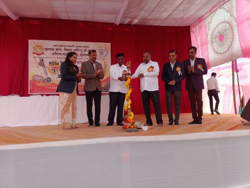 यावेळी व्यासपीठावर संस्थेचे चेअरमन महेशभाऊ फालक, महाविद्यालयाचे प्राचार्य प्रा. डॉ. बी. एच. बऱ्हाटे, उपप्राचार्य प्रा. डॉ. डी. एन. पाटील व प्रा. डॉ. जी. आर. वाणी, कला मंडळ प्रमुख प्रा. स्मिता बेंडाळे आदी मान्यवर उपस्थित होते.