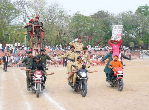 भुसावळातील बियाणी मिलिटरी स्कूल मध्ये वार्षिक स्नेहसंमेलन प्रसंगी मोटरसायकल पिरॅमिडचा चित्त थरारक दृश्य सादर करताना विद्यार्थी.