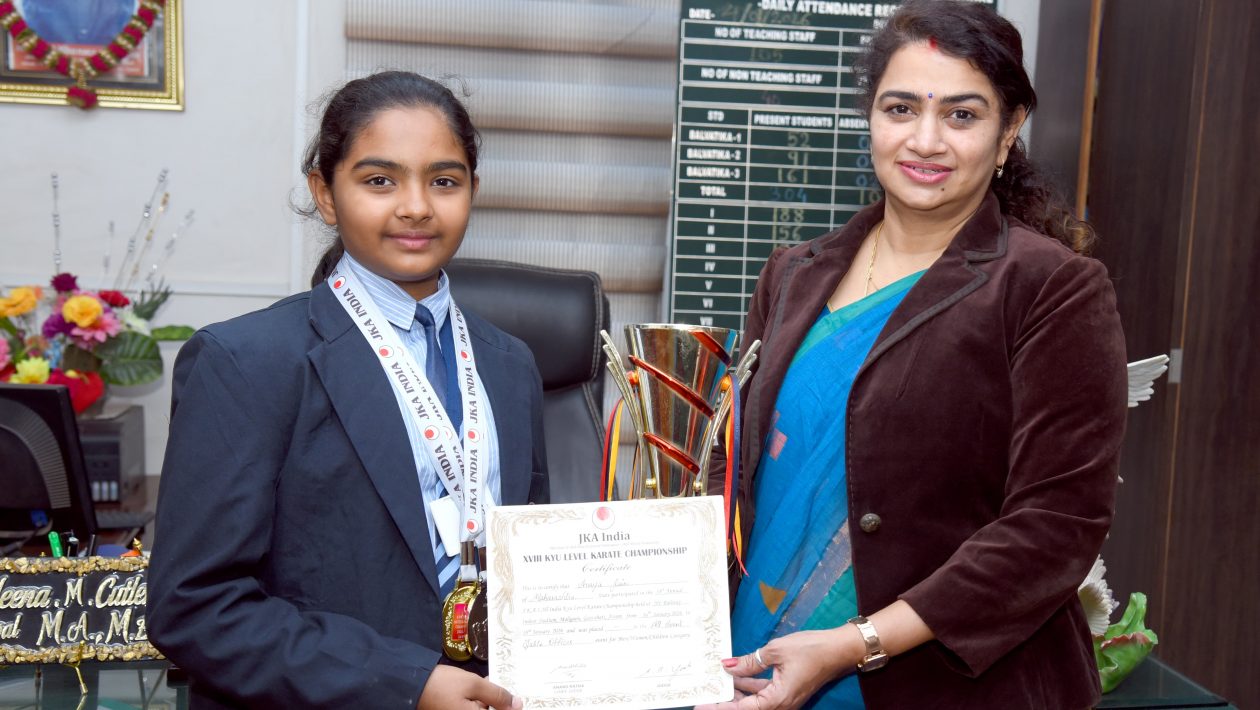 फोटो कॅप्शन – ताप्ती पब्लिक स्कूलची विद्यार्थिनी अनन्या जैन हिला सन्मानित करताना प्रिन्सिपल निना कटलर.