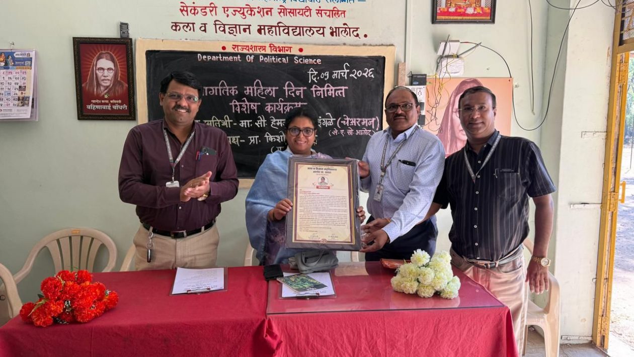 सेकंडरी एज्युकेशन सोसायटी संचलित कला व विज्ञान महाविद्यालय भालोद येथील राज्यशास्त्र विभागाच्या वतीने आयोजित करण्यात आलेल्या जागतिक महिला दिन निमित्त विशेष कार्यक्रमांमध्ये त्या बोलत होत्या. कार्यक्रमाची प्रस्तावना राज्यशास्त्र विभाग प्रमुख प्रा डॉ सुनील नेवे यांनी केली. याप्रसंगी संस्थेच्या चेअरमन सौ हेमलता ताई इंगळे यांना राज्यशास्त्र विभागाच्या वतीने सन्मानपत्र देण्यात आले. सेकंडरी एज्युकेशन सोसायटीच्या शताब्दी वर्षांमध्ये महिला चेअरमन म्हणून त्यांची निवड झाली त्याबद्दल त्यांना हे सन्मानपत्र देण्यात आले. सन्मान पत्राचे वाचन विद्यार्थिनी हेमांगी इंगळे हिने केले.