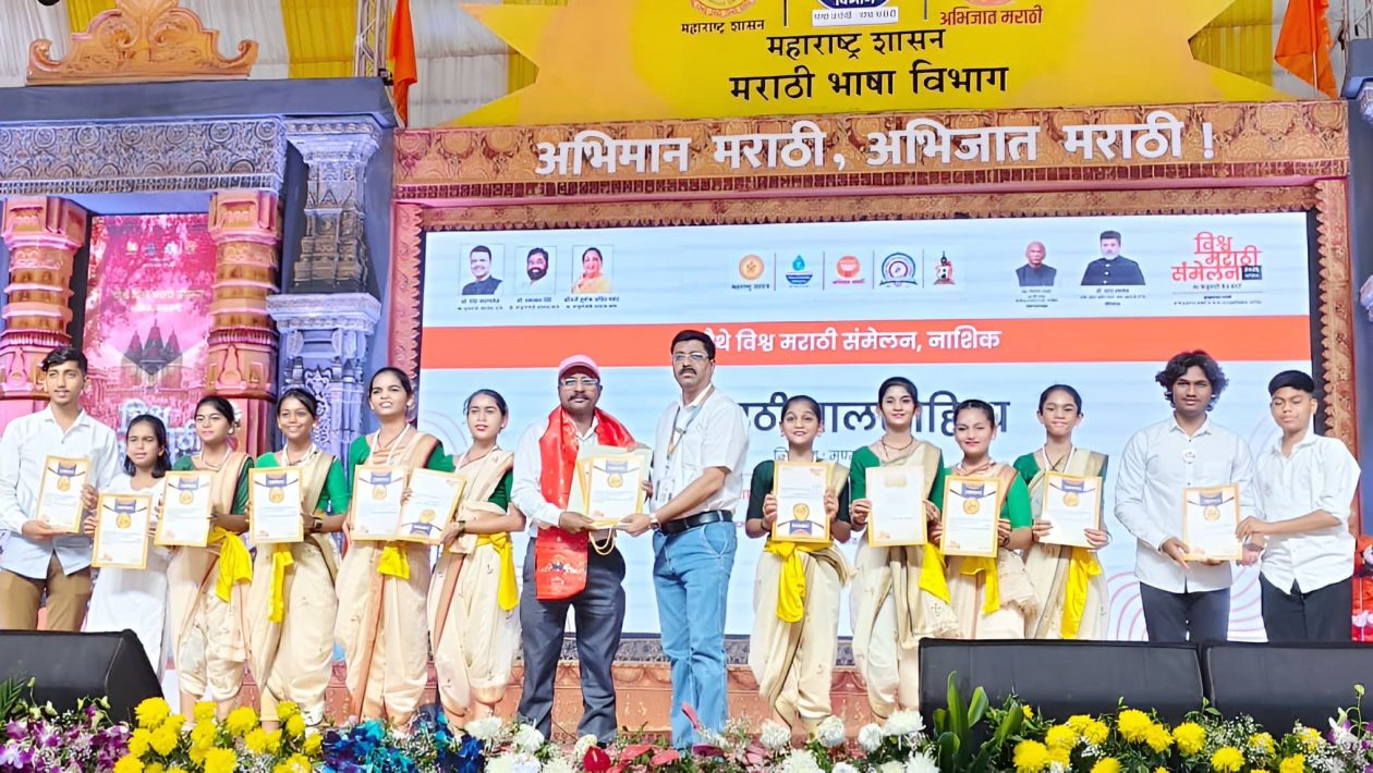 अनुभूती इंग्लिश मिडीयम स्कूलच्या मुख्याध्यापिका रश्मी लाहोटी यांच्या मार्गदर्शनाखाली नृत्य शिक्षक ज्ञानेश्वर सोनवणे यांच्या विद्यार्थिंनीं व वादकांनी नाशिकमधील विश्व मराठी संमेलनात जळगावचा झेंडा दिमाखात रोवला. या कलावंतांना बालरंगभूमी परिषद मध्यवर्ती मुंबईच्या अध्यक्षा ॲड.निलम शिर्के सामंत व प्रभारी प्रमुख कार्यवाह योगेश शुक्ल यांच्या प्रयत्नातून ही संधी मिळाली होती. या मिळालेल्या संधीचे आपल्या जोशपूर्ण नृत्याने या विद्यार्थिंनींनी सोने केले. सादरीकरणानंतर उपस्थित मान्यवरांच्या हस्ते सहभागी विद्यार्थिंनी डिंपल चौधरी, भूमिका चौधरी, रेणुका पवार, पूर्वी भावसार, चिन्मयी जंजाळकर, स्वरा महाजन, सुंदरम चिमकर, विद्या सपकाळे, चेतन धनगर, हर्षिता निकुंभ तसेच वादक मोहित सोनवणे, ललित पवार, वेदांत जडे, रोहन चव्हाण, सचिन महाजन यांच्यासह संघप्रमुख ज्ञानेश्वर सोनवणे यांचा प्रमाणपत्र आणि स्मृतिचिन्ह देवून गौरव करण्यात आला. अनुभूती इंग्लिश मिडीयम स्कूलचे अध्यक्ष अतुल जैन व संचालिका निशा अनिल जैन यांनी विद्यार्थ्यांसह शिक्षकांचे कौतूक आहे.