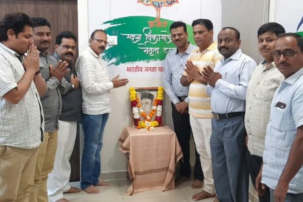 स्वातंत्र्यवीर विनायक दामोदर सावरकर यांच्या पुण्यतिथी निमित्त आमदार संजय सावकारे यांच्या संपर्क कार्यालयात प्रतिमा पूजन करण्यात आले . प्रतिमा पूजन करतांना प्रमोद सावकारे. अँड बोधराज …